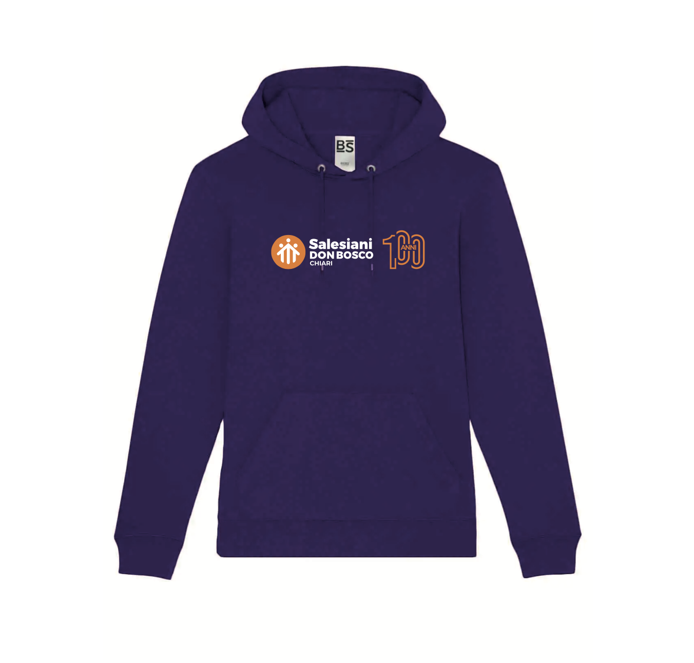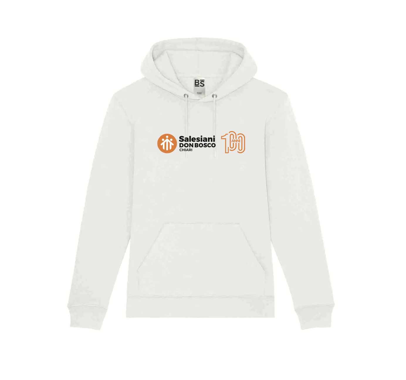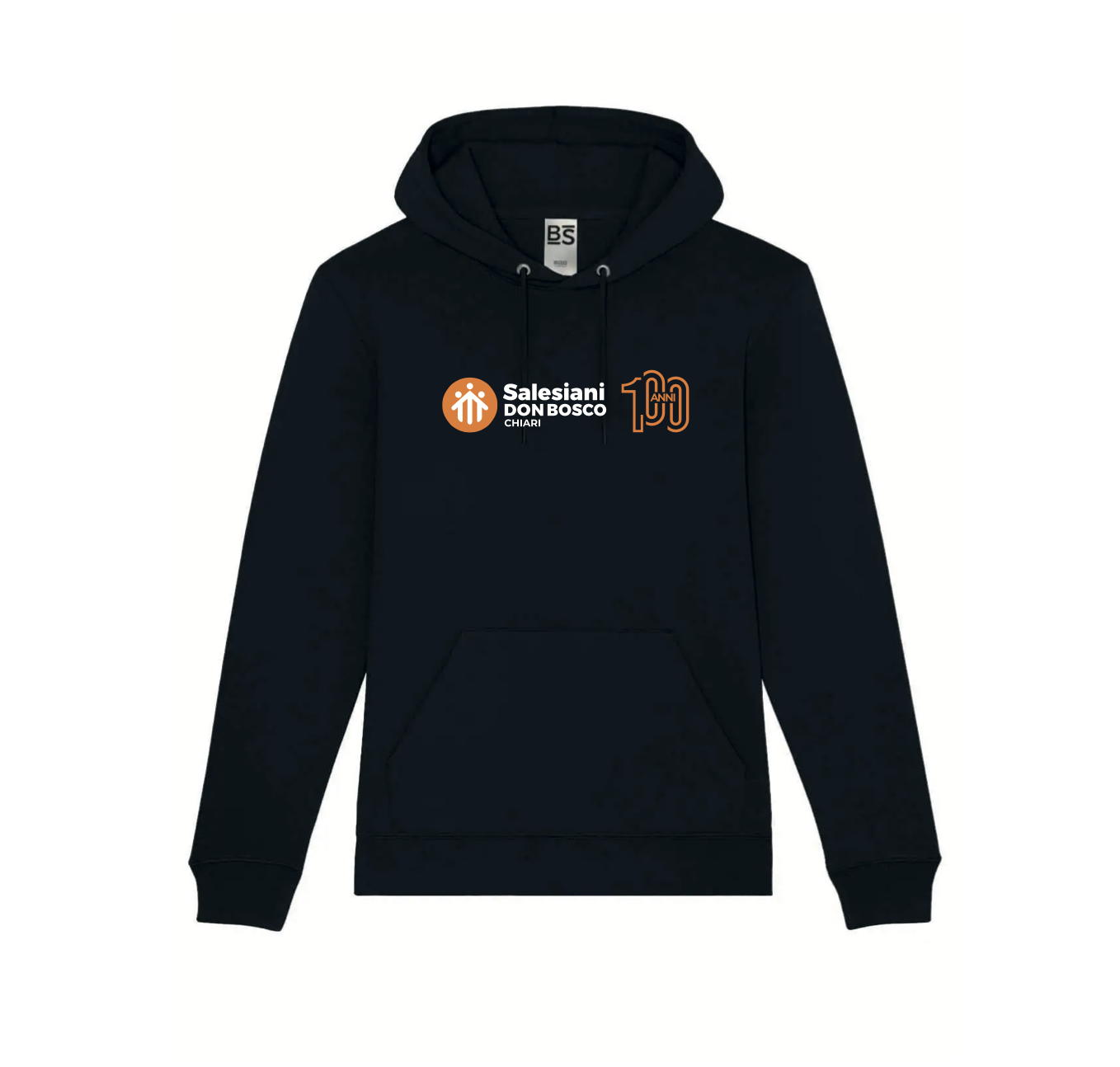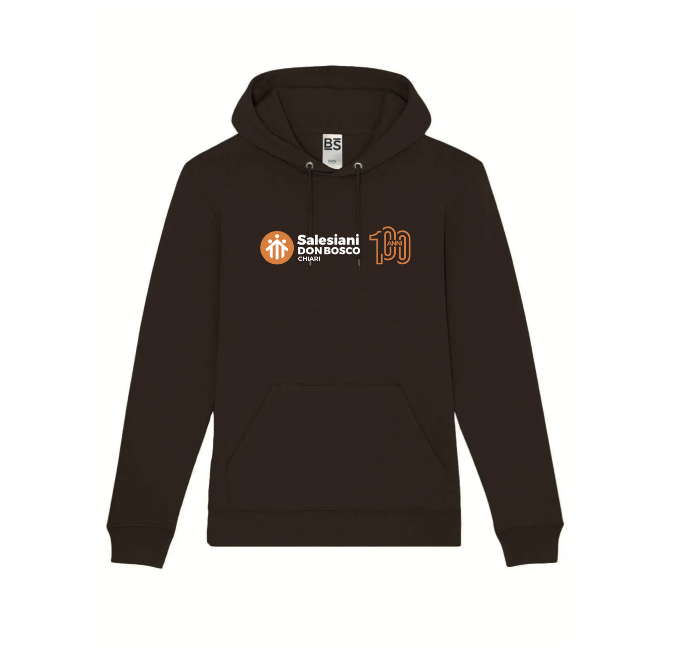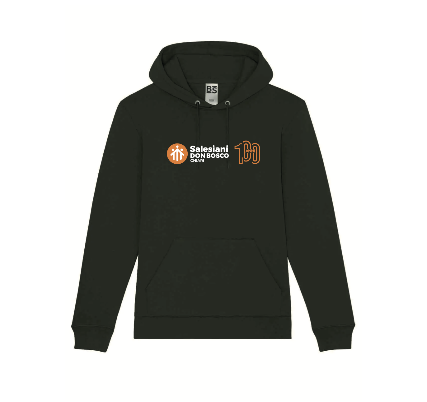 70% cotone, 30% poliestere. Felpa con maniche set-in, unisex, felpata internamente, cappuccio a doppio strato, occhielli in metallo, cordini con punta in metallo, grande tasca a marsupio, struttura con cuciture laterali, fascia in vita e polsini in costina. Etichetta strappabile. Interno in poliestere ed esterno 100% cotone