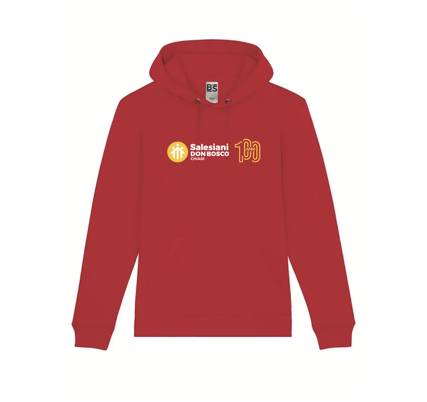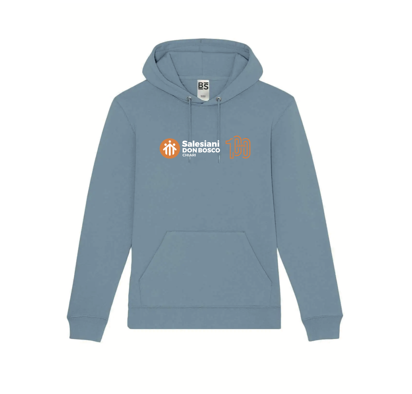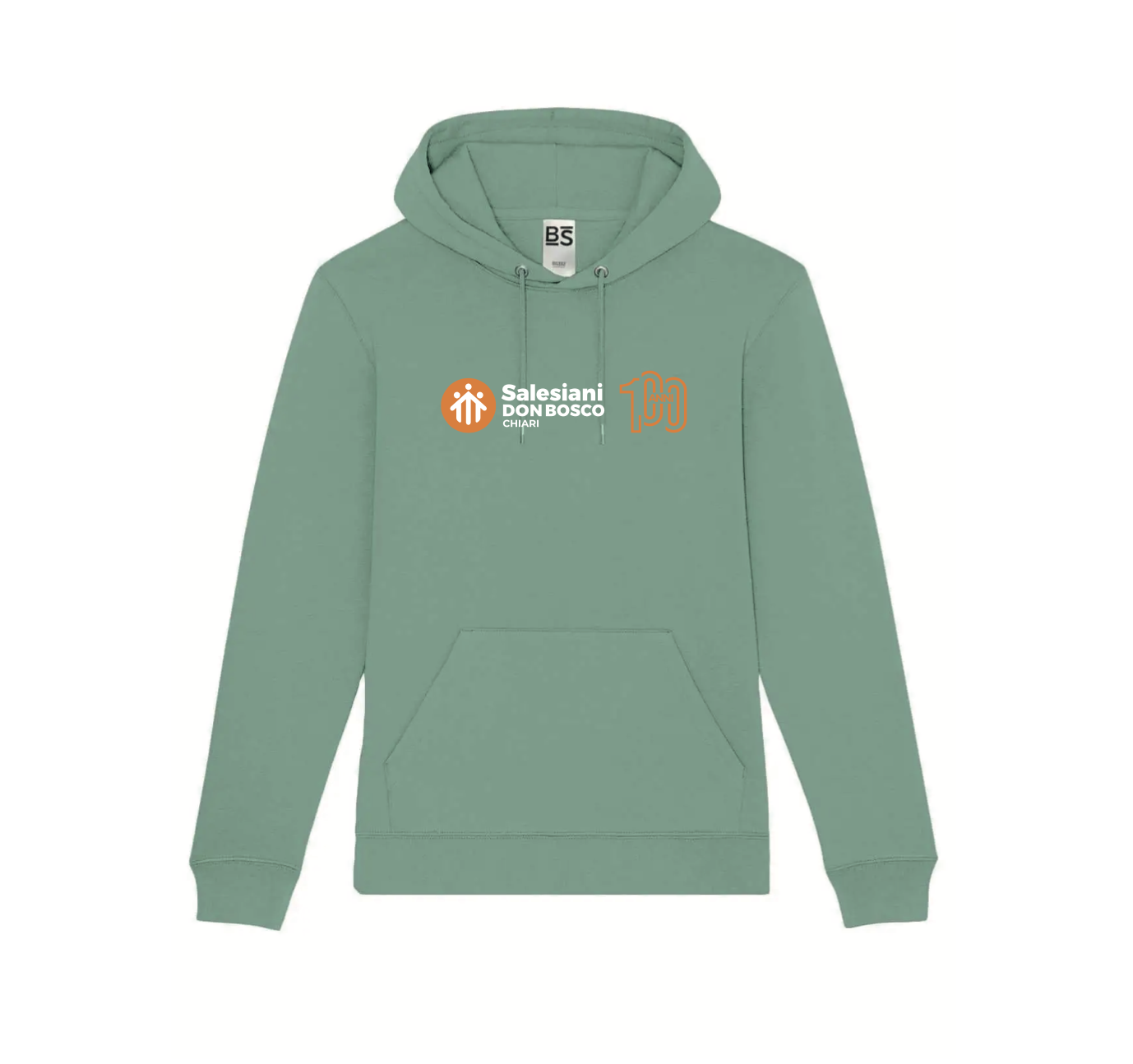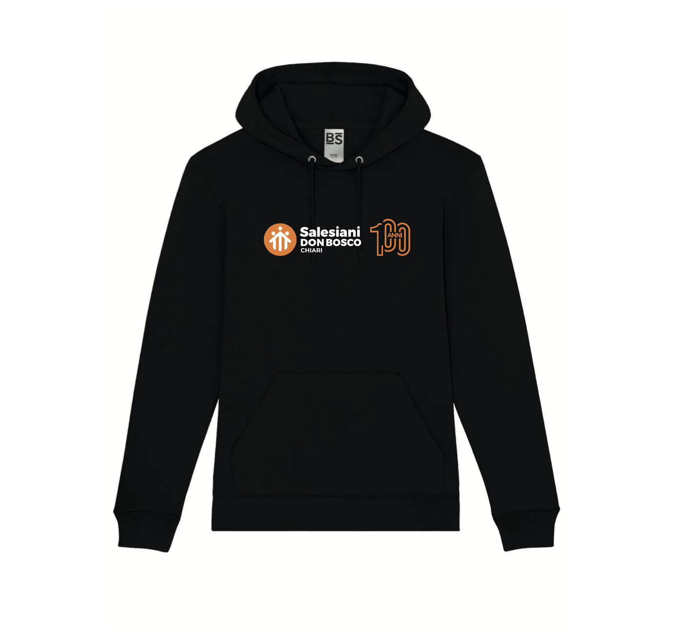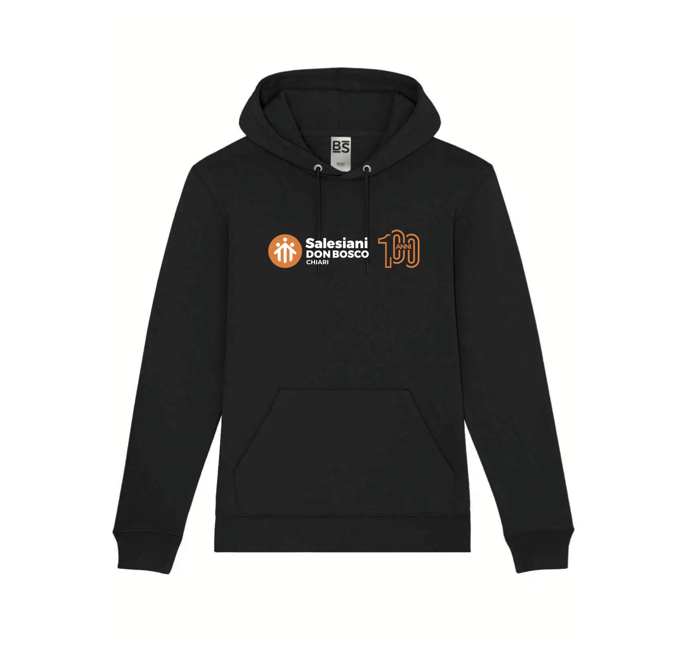 70% cotone, 30% poliestere. Felpa con maniche set-in, unisex, felpata internamente, cappuccio a doppio strato, occhielli in metallo, cordini con punta in metallo, grande tasca a marsupio, struttura con cuciture laterali, fascia in vita e polsini in costina. Etichetta strappabile. Interno in poliestere ed esterno 100% cotone
