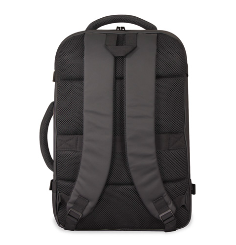 Zaino da cabina aereo multiaccessoriato, progettato per offrire massima versatilità e organizzazione. Realizzato in PU opaco goffrato con interno in mesh garzata, un innovativo tessuto idrorepellente e resistente all’usura. Il capiente comparto principale è ideale per abiti ed effetti personali, con divisorio interno doppio: da un lato cinghie elastiche per tenere in ordine il contenuto, dall’altro un’ampia tasca in rete per accessori o documenti. Il comparto posteriore imbottito ospita laptop fino a 15”, garantendo protezione e praticità durante gli spostamenti. In vano frontale, anch’esso accessoriato con organizer, permette di avere a portata di mano tutto il necessario per il lavoro o il viaggio. Spallacci e schienale imbottiti in mesh traspirante assicurano comfort, mentre la fascia posteriore per trolley e la maniglia laterale imbottita rendono il trasporto estremamente comodo, anche come borsone. I quattro riduttori di volume con sgancio rapido completano un design tecnico e curato. Ideale come regalo aziendale o regalo personalizzato per professionisti e manager, valorizza il brand unendo funzionalità, eleganza e spirito dinamico in viaggio o al lavoro.